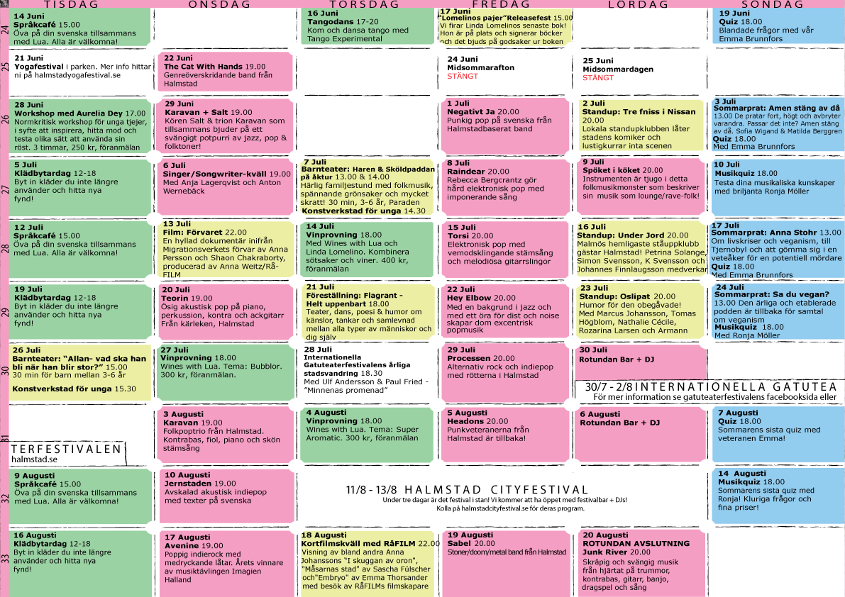Vi vill erbjuda ett brett program fyllt med musik, standup, teater, workshops och föreläsningar som fyller sommarens dagar. Alla våra evenemang är gratis och öppet för alla ❤︎